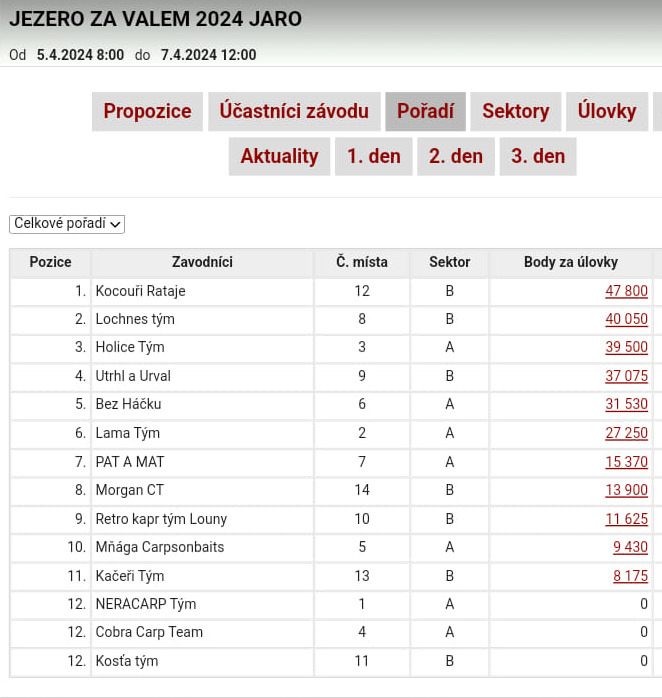 Bohužel přišla studená sprcha v podobě následujících 20 hodin nedokázali ulovit dalšího kapra a propadli jsme se na 7. místo.